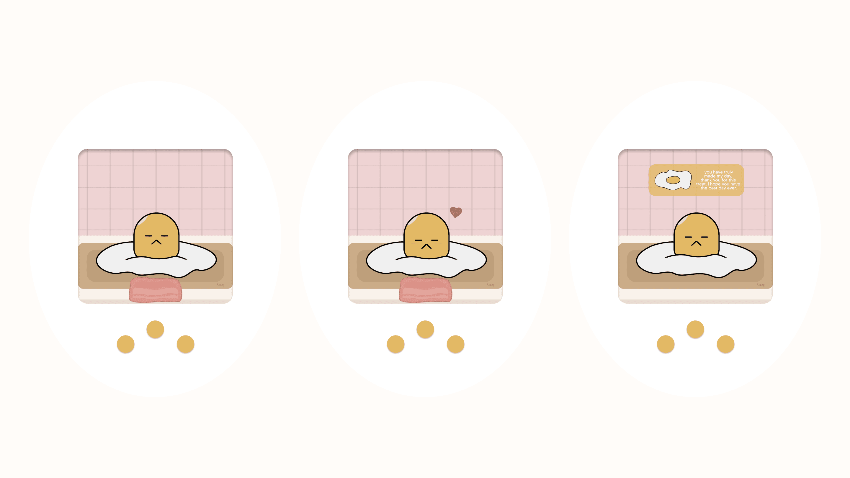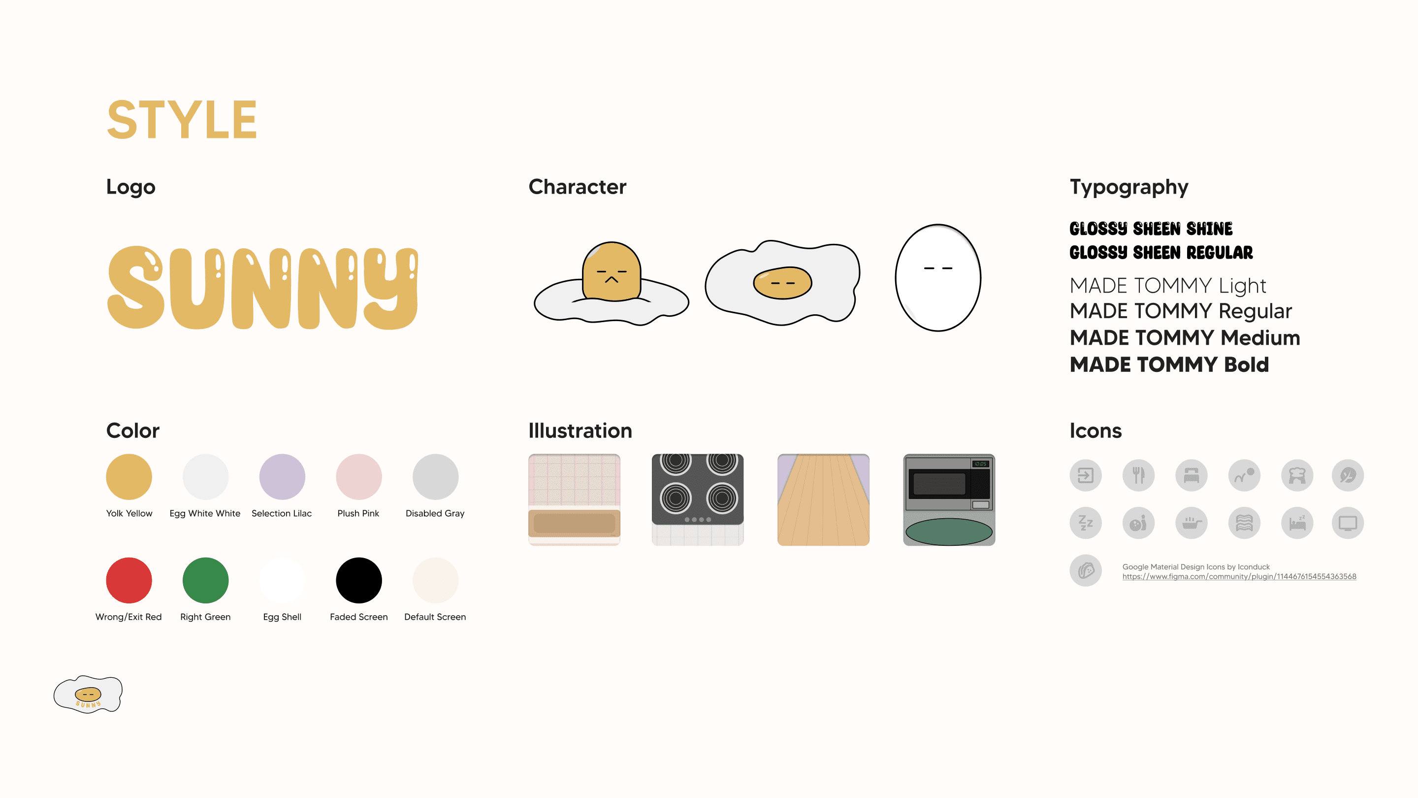 Sunny is a sunny-side-up egg that has been left behind in a kitchen by the previous owners. He lives day-to-day alone on a cutting board, sharing fragments of company with leftover peas and some random kitchen utensils nearby. He loves to eat the ingredients used to make omelets, nibbling on scraps of peppers, spinach, cheese, and bacon. His favorite spot is a warm frying pan, where he would take naps and dream of a happier existence.