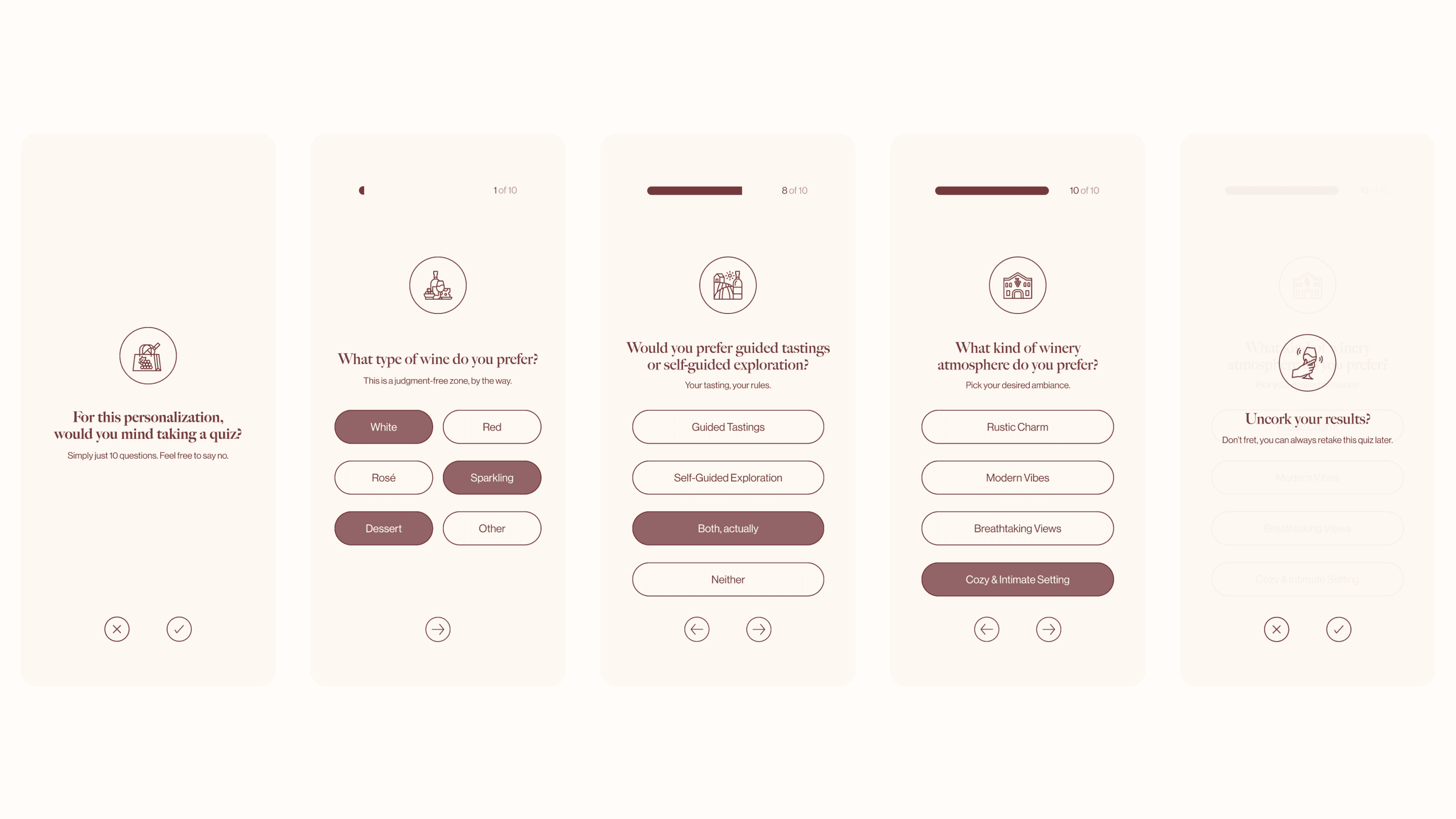 Keeping the competitive research, crafted personas, and my own personal experience in mind, I designed Uncorked specifically with someone like me in mind- a person who enjoys a glass of wine to the point of wanting to explore the beautiful, yet hidden wineries that upstate New York has to offer. Fully designed and prototyped within less than two weeks, I delved immediately into extensive competitor app analyses and usability tests. Taking the red of wines, the green of grape leaves, and the browns of the wine barrels– Uncorked is a seamless and personalized journey for wine enthusiasts, blending thoughtful user-centric design with a passion for the art of wine.