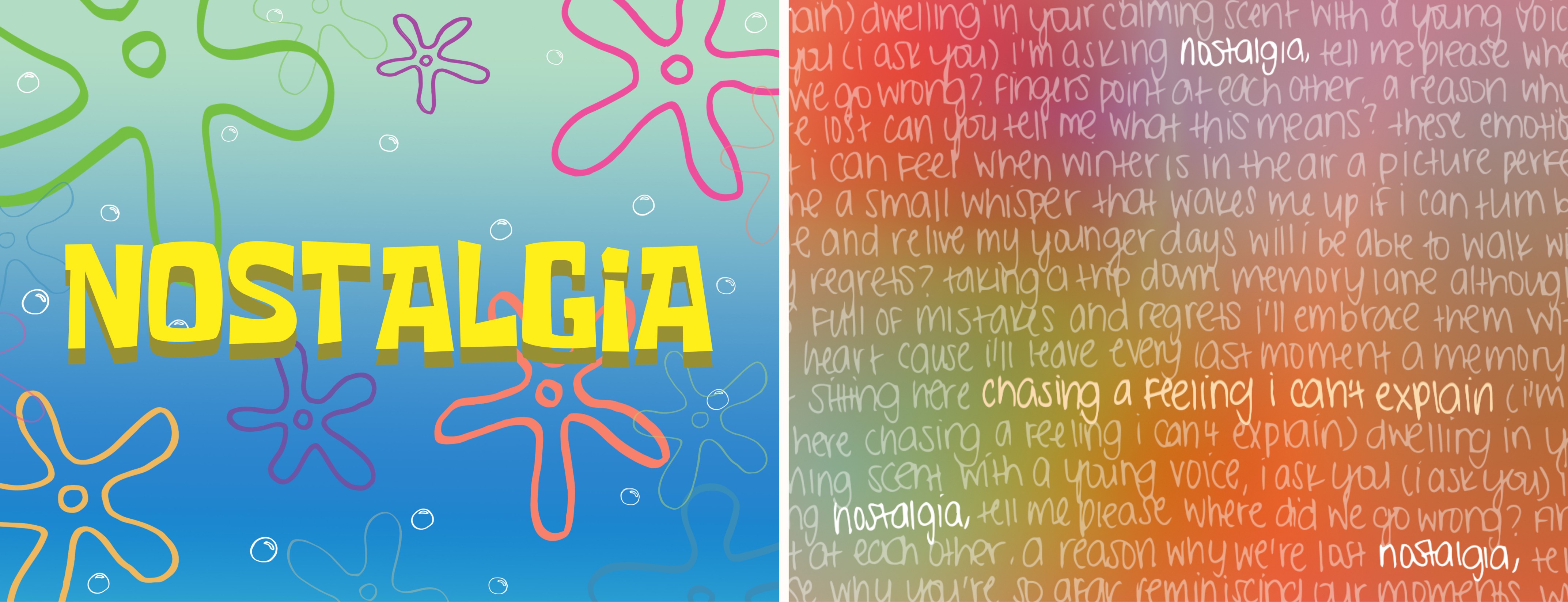 A two-part typography project capturing the emotional depth of “nostalgia” through visual and technical design. The first iteration, inspired by SpongeBob, utilized custom brushes and typography to evoke childhood memories, while the second iteration drew from the song Nostalgia by JUNNY and JAY B. Through a blend of Adobe Illustrator and Photoshop, the project incorporated gradient techniques, text manipulation, and creative brushwork, offering a personal yet universally relatable depiction of the word’s meaning.